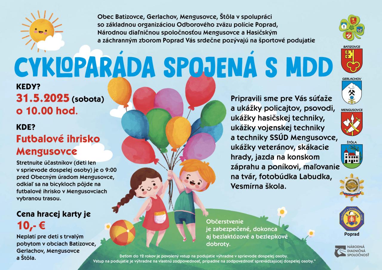 Organizátori sa postarali o detský smiech a dobrú náladu počas celého sobotňajšieho dňa. MDD bol už tradične spojený s Cykloparádou a uskutočnil sa na futbalovom ihrisku v Mengusovciach 31.05.2025 o 10.00 hod. Pre veľkých aj malých návštevníkov bolo pripravené veľké množstvo atrakcií a súťaži (fotobudka Labudka, Veteráni, Klub vojenskej histórie, Polícia SR, Dobrovoľný hasičský zbor, NDS Mengusovce, Skákací hrad, maľovanie na tvár, Vesmírna škola, súťaže a diskotéka pre deti a pod.). Všetkým organizátorom ďakujeme a veríme, že odmenou pre nás všetkých boli rozžiarené očká našich detí a smiech ktorý bolo počuť široko ďaleko. O rok sa vidíme opäť.
